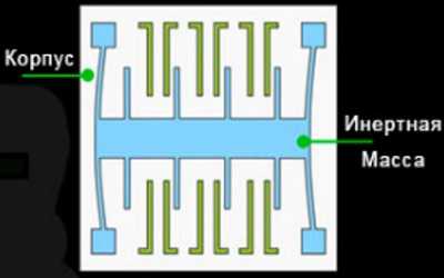 В гиродатчике есть две массы, двигающиеся в противоположных направлениях. Когда возникает угловая скорость, на массу действует сила Кориолиса, направленная перпендикулярно их движению. Происходит смещение масс на величину, пропорциональную прикладываемой скорости. Меняется расстояние между подвижными и статичными электродами, что приводит к изменению емкости конденсатора и напряжению на его обкладках, а это теснее электрический сигнал. Такие электронные сигналы и распознаются гиродатчиком.