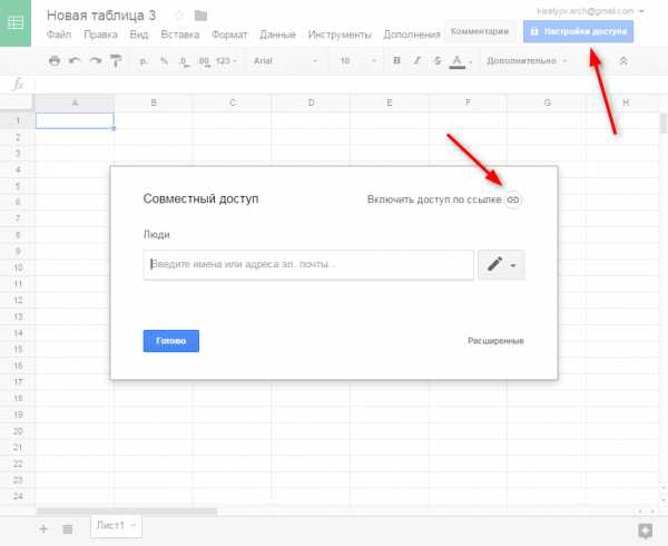 Нажмите большую синюю кнопку «Настройки доступа» (при необходимости введите название таблицы). В верхнем углу окошка нажмите «Включить доступ по ссылке».