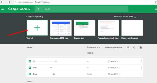 После этого в браузере откроется стартовая страница Гугл Таблиц. Вверху будут варианты шаблонов, ниже в виде списка показаны документы, что создавали вы сами, или доступ к которым вы получили. Чтобы добавить таблицу, из шаблонов нужно выбрать первый вариант: «Чистый».