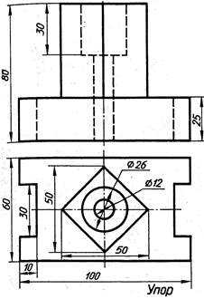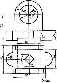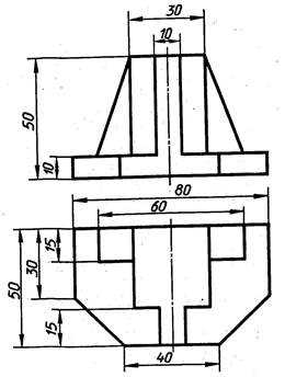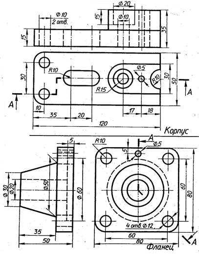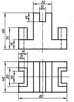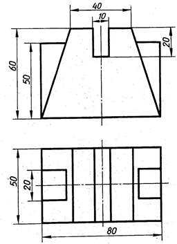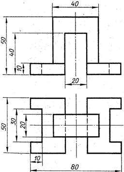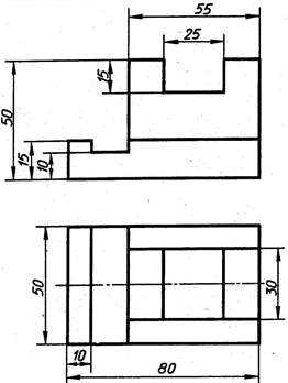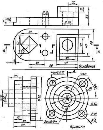 Во всех примерах исходными условиями являются главный вид и вид сверху, без разреза, с невидимыми контурами. Все размеры стоят на этих двух видах.