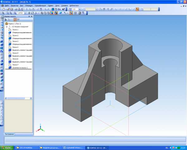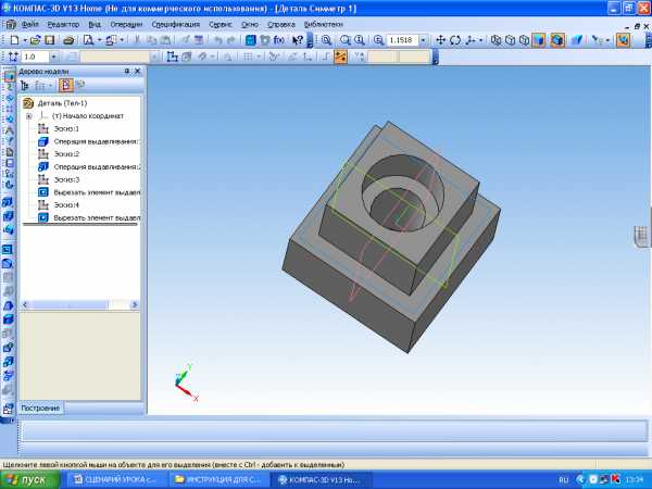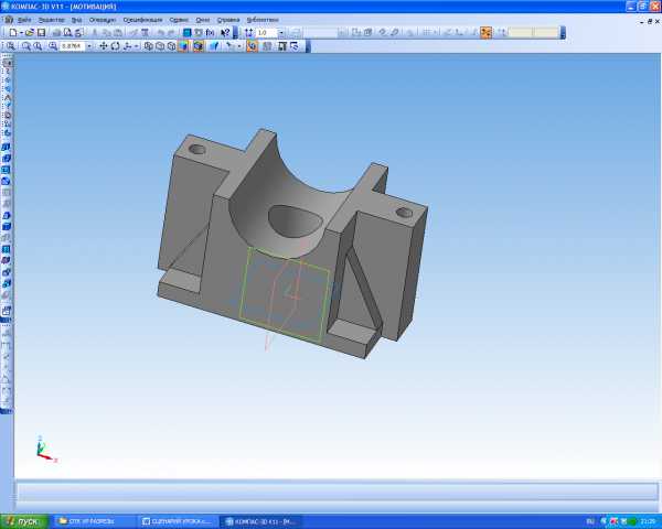 (Основание детали – параллелепипед, на котором стоит второй параллелепипед, в котором круглое отверстие большого диаметра и малого диаметра.)