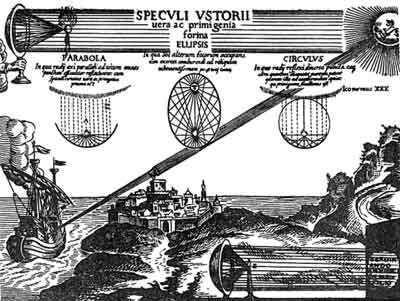 ……Кроме математики и механики, Архимед занимался оптикой и астрономией. Сохранилась легенда о том, что Архимед использовал в борьбе с римским флотом вогнутые зеркала, поджигая корабли противника сфокусированными солнечными лучами. Имеются сведения о том, что Архимедом было написано не дошедшее до нас сочинение по оптике «Катоптрика». Из дошедших до нас отрывков, цитируемых авторами, видно, что Архимед хорошо знал зажигательные свойства вогнутых зеркал, проводил опыты по преломлению света, знал свойства изображений в плоских, выпуклых и вогнутых зеркалах.
