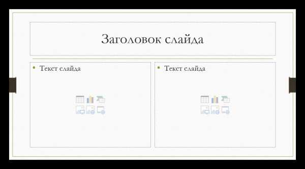 «Два объекта» или «Сравнение». - Шаблон автоматически применится к слайду. Теперь можно использовать сразу два окна для введения текста.