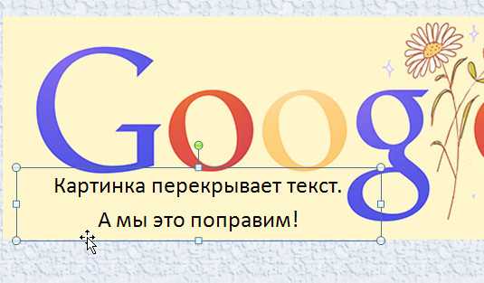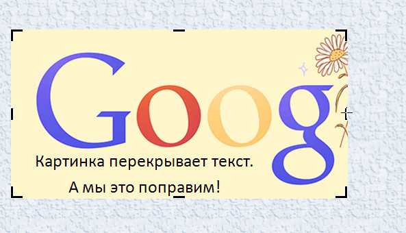 Теперь текст оказался поверх картинки, можно его только немного передвинуть, чтобы его лучше было видно.