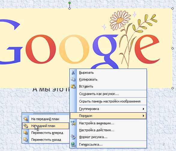 Как вывести текст поверх картинки? Очень просто! Щелкаем на ней правой кнопкой мыши и командуем – «На задний план».