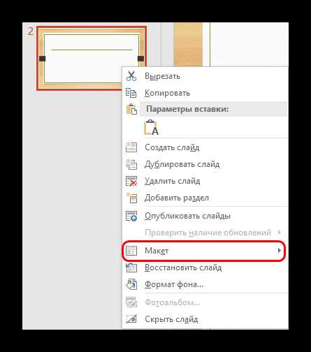 - Достаточно нажать правой кнопкой мыши по нужному слайду и навести на пункт всплывающего меню «Макет».