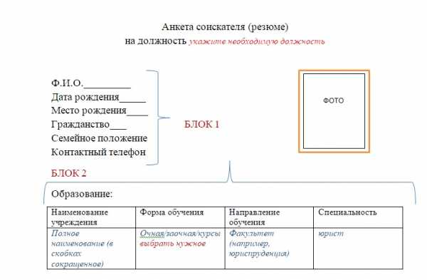 - Сведения об образовании (основное плюс дополнительное, если есть, блок включает в себя: наименование учреждения, форма обучения, кафедра, специальность, год окончания)