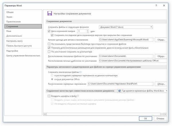 - Нажать на кнопку «Обзор» рядом со строкой «Каталог данных для автосохранения» и указать папку, куда будут помещаться временные файлы Word.