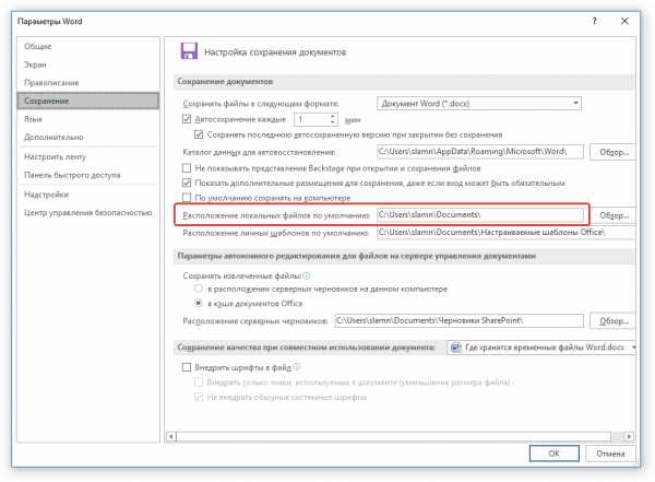Благодаря этому же окну можно найти и последний сохраненный документ. Если вы не знаете его местонахождение, обратите внимание на путь, указанный напротив пункта «Расположение локальных файлов по умолчанию».