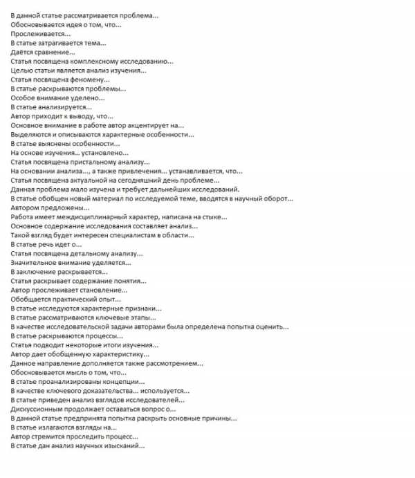 Итак, вот перечень некоторых фраз и оборотов, что часто используется в написании аннотации к научной статье. Это своеобразный образец того, что обязательно должно присутствовать в том результате, что желаете получить.