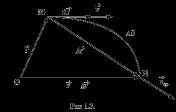 Пусть материальная точка движется по криволинейной траектории МN так, что в момент времени t она находится в т.М, а в момент времени в т. N. Радиус-векторы точек М и N соответственно равны , а длина дуги МN равна (рис. 1.3).