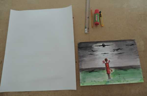 Необходимые материалы: линейка, карандаш, клей, бумажный нож, бумага формата А2, готовая картина формата А3.