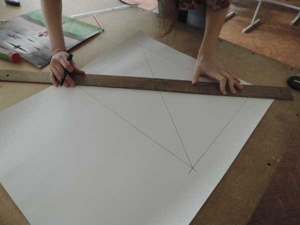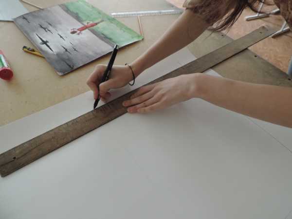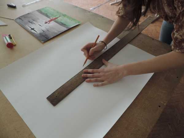 Необходимо расположить бумагу формата А2 перед собой вертикально. С помощью линейки найдём середину листа.