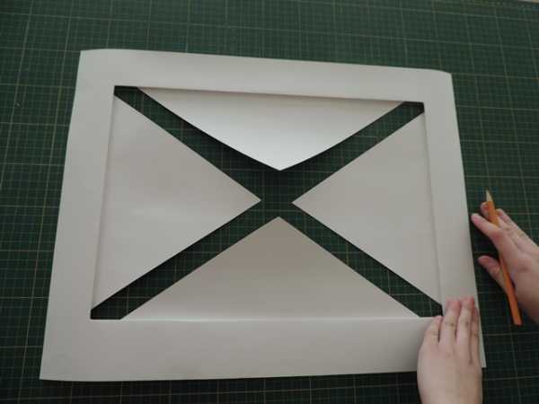 Затем, прежде чем начать отгибать получившиеся треугольные конвертики, снова берем нож и осторожно, не прорезая насквозь бумагу), проводим по расчерченным линиям ножом. Это для того, чтобы когда будем открывать окно, были более ровные края. Итак, надрезали и отвернули треугольные конвертики!