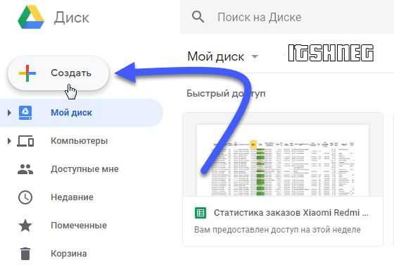 Открываем Google Disk (само собой у вас должен быть аккаунт Google) и в левом верхнем углу находим кнопку «Создать»