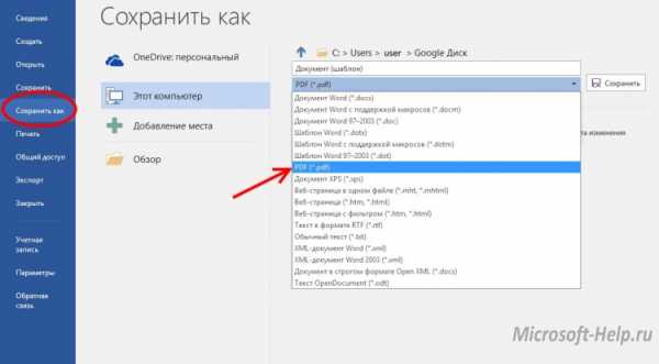 В итоге, для того, чтобы сохранить готовый документ, необходимо перейти на вкладку «Файл», выбрать пункт «Сохранить как», указать имя файла и в нижнем поле выбрать формат «PDF»
