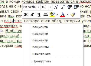 - 2 Щелкнув правой кнопкой мыши по слову, подчеркнутому красной линией, или по фразе (предложению), подчеркнутой зеленой линией, откроется меню с вариантами исправлений или действий. Вы увидите список предлагаемых правильных (с точки зрения системы) слов (для замены подчеркнутого слова или фразы). Но вы всегда можете нажать «Игнорировать» или «Игнорировать все».