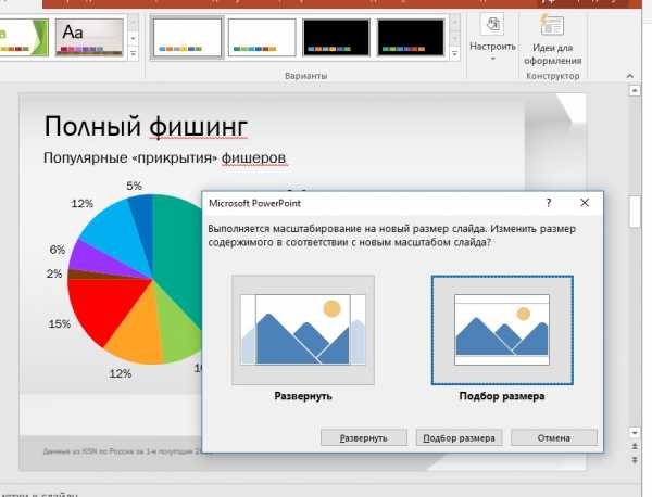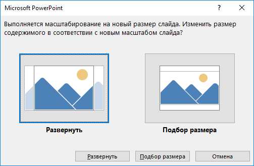 Если вы меняли первоначальные настройки, то в открывшемся окне вы можете адаптировать шрифты и картинки, исходя из размеров нового формата. В таком случае вместо опции «Развернуть» вам необходимо выбрать опцию «Подбор размера». При этом вы не привязаны к размеру слайда, предлагаемому PowerPoint, и можете определить свой размер.