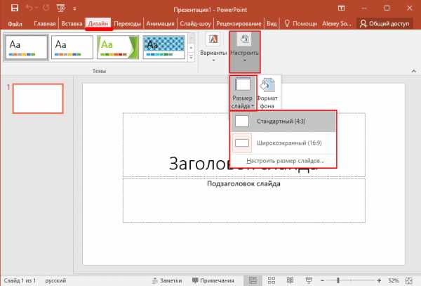 - Пункт «Размер слайдов» содержит еще несколько шаблонов для габаритов листов, их можно выбрать и применить либо отредактировать ниже.