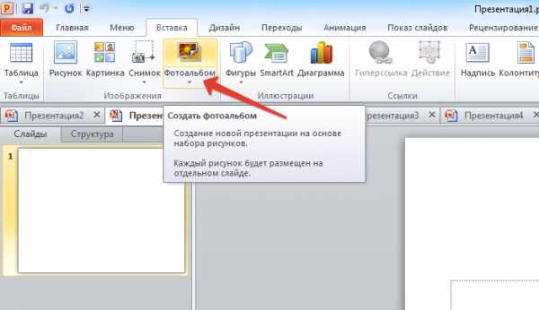 - Открываем вкладку Вставка, находим Фотоальбом.
