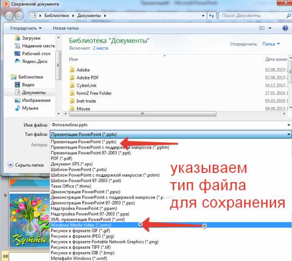 - Сохраняем Презентацию стандартным способом (чтобы в случае необходимости вносить изменения) и здесь же сохраняем второй раз, как файл Windows Media Video (с расширением .wmv). Второе сохранение позволит просматривать вашу Презентацию в любом проигрывателе.