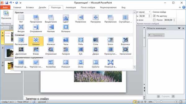 Для этого выберите нужный слайд в колонке слева. Далее в разделе «анимация» выберите «стиль перехода». Здесь можно выбрать десятки разных смен страниц! Кстати, при наведении на каждую — вы будете видеть, как страничка будет отображаться при демонстрации.