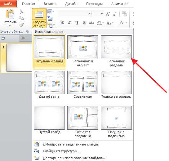 После нажатия на данную кнопку будет добавлен стандартный слайд под названием «Заголовок и объект». Если вы хотите добавить слайд другого типа, то нужно нажать на небольшую стрелку внизу, которая находится сразу под кнопкой «Создать слайд». После этого откроется небольшое меню со списком слайдов различных типов. Здесь нужно выбрать один из доступных вариантов. Например, вы можете выбрать «Титульный слайд» или слайд «Заголовок раздела».