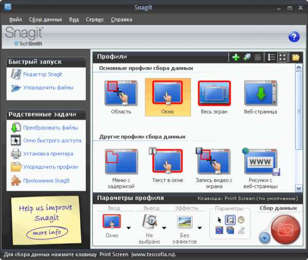 Называется она «SnagIt» и предназначена для создания скриншотов и записи видео с экрана. После того, как вы её запустите откроется окно с настройками и инструментами. Возможно свежая версия Snagit будет чем-то отличатся от моей устаревшей.