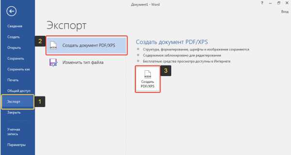 Перейдите в меню «Файл». В следующем окне выберите «Экспорт» (1) > «Создать документ PDF/XPS» (2) и нажмите кнопку «Создать PDF/XPS» (3).