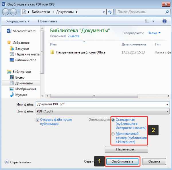 Откроется проводник Windows, где выберите папку для сохранения вашего PDF документа и нажмите «Опубликовать» (1). Если вам нужно уменьшить размер файла на выходе за счёт уменьшения качества самого PDF документа, то выберите «Минимальный размер» в блоке «Оптимизация» (2).