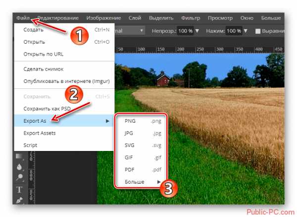 - Закончив работу с фотографией, экспортировать ее вы можете с помощью меню «Файл» — «Export as», где и выберите итоговый формат графического документа.