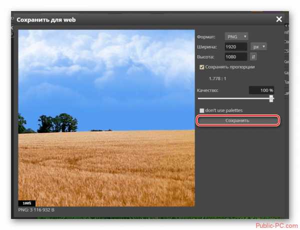 Во всплывающем окне установите желаемые параметры для готовой фотографии и нажмите на кнопку «Сохранить». Изображение сразу же будет загружено в память вашего компьютера.