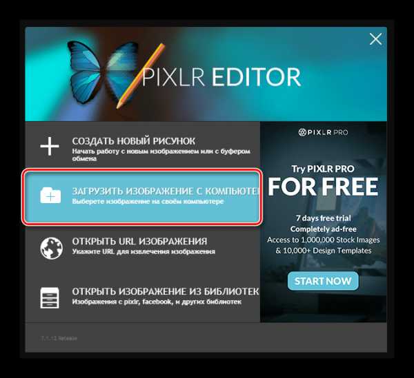 - Для начала на сайт нужно загрузить редактируемое изображение. Сделать это можно несколькими способами. Например, воспользоваться комбинацией клавиш Ctrl+O, нажать на ссылку «Открыть с компьютера», что расположена в центральной части экрана. Также можно кликнуть на пункт «Файл» и в контекстном меню выбрать «Открыть».