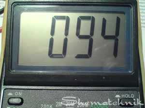 Так как у перехода эмиттера прямое сопротивление больше чем у перехода коллектора (728 > 725 в нашем случае) то вывод коллектора слева, а эммитера справа. Для достоверности проверим его на спец. разъеме для определения коэффициента передачи. Индикатор показавает 94 рис. 8 значит выводы мы определили правильно рис. 9.
