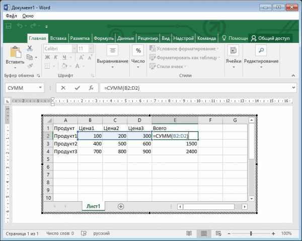 Вот пример. Я заполнил стандартные ячейки значениями и использовал одну из самых распространенных формул суммы для ячеек в последнем столбце. Итак, для значения «Всего» для «Продукт1» в ячейке E2 я использую формулу «СУММ(B2: D2)», чтобы добавить все три значения в строку и автоматически получить мою итоговую сумму. Вы можете использовать любую формулу Excel, которая Вам нравится в этой встроенной версии программы.