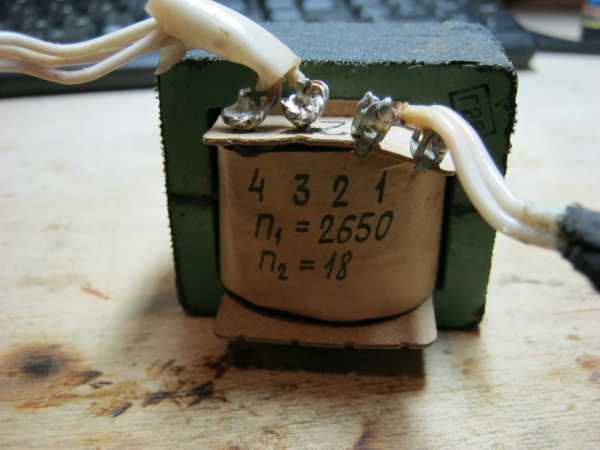 Его первичная обмотка — это цифры 1,2. Вторичная обмотка — цифры 3,4. N1 — 2650 витков, N2 — 18 витков. Транс построен по упрощенной конструкции: