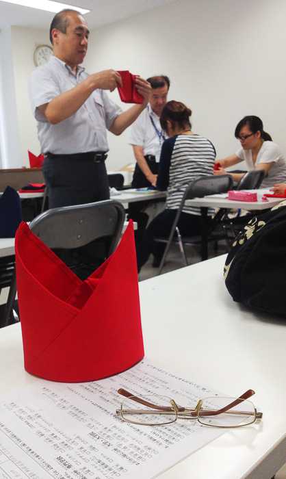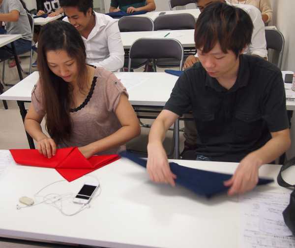 Все преподаватели колледжа – специалисты в своем профиле. Один из пришедших на презентацию, например, в прошлом 16 лет проработал в ресторанном бизнесе. Начав еще во времена старшей школы временным работником в кафе, позже, выучившись, он занимал очень ответственные должности в своей карьере, но азы, как разъяснил, навсегда одни и те же – сделать заведение презентабельными в глазах клиентов. Чтобы испытать это на себе, мы под руководством сенсеев собственноручно принялись складывать тканевые салфетки в различные фигуры (от простейших, до Микки Мауса!), походу слушая элементарные, казалось бы, но очень познавательные правила этикета – не как привыкли, с точки зрения посетителя, а со стороны работников ресторана. Выходило весело! Насколько я плоха в оригами, настолько, вроде бы, должна была быть плоха в складывании непослушных тканевых салфеток, но, как ни удивительно, многое получалось. Очень интересный опыт. Сенсеев все благодарили от души.