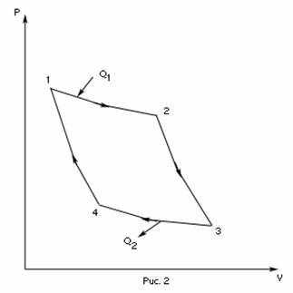 Рабочее тело отсоединяют от холодильника и газ адиабатически сжимают до исходного состояния 1 с параметрами (P1,V1,T ). При этом внутренняя энергия возрастает и температура повысится до первоначального значения Т.