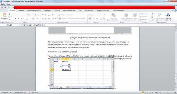 Вы можете передвигать границы столбцов, строк, а также всей таблицы, чтобы настроить её размер. Но это не самое главное. Суть этого способа в том, что, кроме самой таблицы, вы получаете также доступ ко всем возможностям, которые есть в Excel. Когда таблица активна, они будут располагаться на ленте меню вместо функций Word. То есть, по сути, вместо ленты меню Word у вас будет лента меню Excel. Таким образом, вы сможете проводить все операции с данными, которые доступны в этой программе.