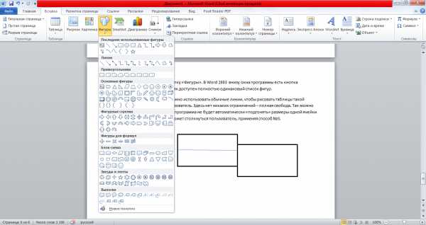 В Word 2007, 2010 и 2013 доступ к списку фигур осуществляется чрез вкладку «Вставка» и кнопку «Фигуры».