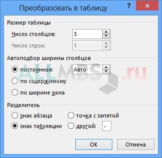 Создание таблицы в Ворде при помощи конвертирования текста
