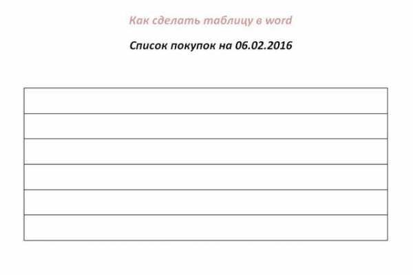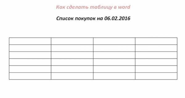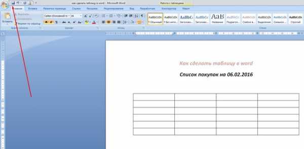 Создаем пустой документ, обязательно сохраняем его в удобном месте, и с осмысленным названием, например Как сделать таблицу в word.docx или с расширением *.doc кому как нравится, все равно Word поставит расширение по умолчанию. Пишем текст: список покупок на 06.02.2016, испортим ему субботу… Оформляем по своему вкусу, текст лучше расположить по центру, для этого выделяем мышкой текст и на ленте Главная нажимаем на иконку Выравнивание текста по центру. Ниже отступаем на два абзаца, дважды нажав Enter. На ленте выбираем вкладку Вставка, на ней