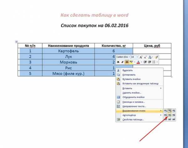 Заполним наконец её значениями, начав с шапки, в первой строке пишем № п/п, Наименование продукта, Количество, Цена. В первом столбце после № п/п проставим номера строк. Заполним желаемым содержимым….))) Выравнивание в ячейках делается так: выделяем кусок/всю таблицу, клик правой кн. по пункту контекстного меню Выравнивание ячеек и выбираем подходящий тип(по центру, слева, справа..).