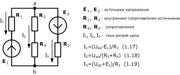 Если необходимо рассчитать одноконтурную электрическую цепь с произвольным количеством источников электрической энергии и резисторов, то следует применять соотношение (1.16), имея ввиду что Ua=Ub.