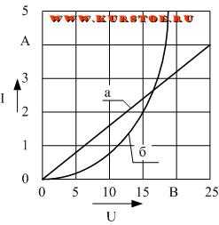 На рисунке под буквой “а” – изображена ВАХ линейной электрической цепи. Под буквой “б” – нелинейной.