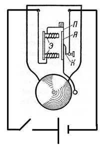 При замыкании цепи электромагнит (Э) притягивает якорь (Я), вследствие этого притяжения молоточек(М) ударяет о звонковую чашу (З). По цепи перестает течь ток, т.к. цепь разомкнулась между якорем(Я) и контактной пружиной(П), и вся установка становится на исходный уровень, якорь касается контактной пружины и по цепи снова течет ток, и снова срабатывает электромагнит, и т.д.
