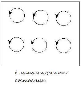 С помощью проекционного аппарата прибор проецируется на экран. Обращают внимание учащихся на беспорядочную ориентацию магнитиков. Затем подносят с двух сторон модели разноименные полюсы прямых магнитов и заставляют стрелочки повернуться определенным образом. На экране получаем картину изображающую магнитное насыщение.