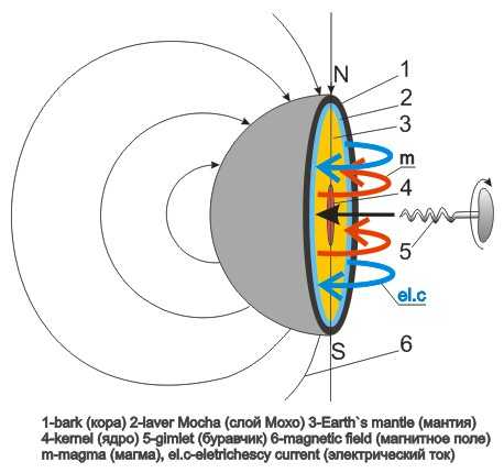 В результате движения магмы, с ее атомов срываются электроны, которые концентрируются в контактном слое между мантией и корой, в результате земная кора приобретает отрицательный заряд, а верхний слой магмы положительный. Разделенные электрические заряды пытаются воссоединиться, и это им периодически удается сделать, поэтому возникает электрический ток, который течет навстречу движения магмы и навстречу вращения Земли.