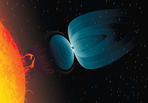 Земля окружена магнитным полем. Именно оно заставляет стрелку компаса указывать на север и защищает нашу атмосферу от постоянной бомбардировки заряженных частиц из космоса, таких как протоны. Без магнитного поля наша атмосфера будет медленно исчезать под воздействием вредного излучения, а жизнь почти наверняка не сможет существовать в том виде, который мы наблюдаем сегодня.