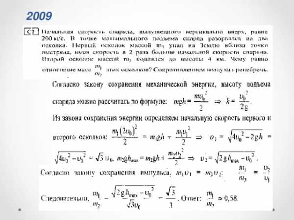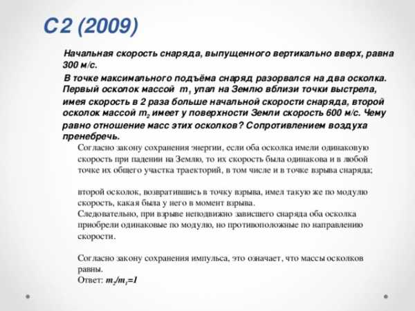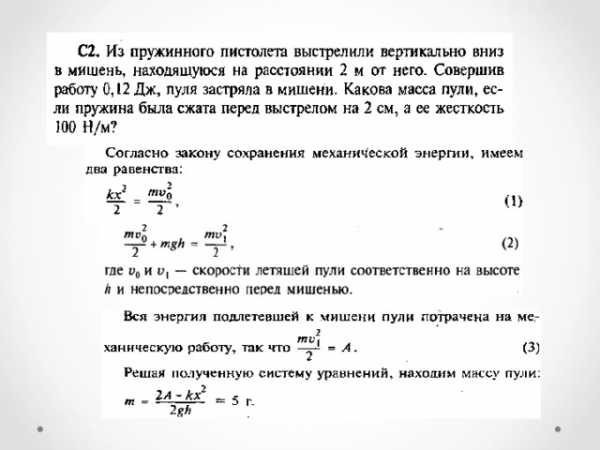 —————————————————————————————————- 1. На опускающегося парашютиста действует сила земного притяжения. Объясните, почему он движется равномерно. 2. Почему машинисту подъемного крана запрещается резко поднимать с места тяжелые грузы? 3. Вагонетка массой 500 кг движется под действием силы 100 Н. Определите ее ускорение. 4. Автобус массой 8000 кг едет по горизонтальному шоссе. Какая сила требуется 5. Два человека тянут за веревку в разные стороны с силой 90 Н каждый. Разорвется ли веревка, если она выдерживает натяжение до 120 Н? 6. На самолет, летящий в горизонтальном направлении, действует в направлении полета сила тяги двигателя F = 15000 Н, сила сопротивления воздуха FC = 11000 Н и сила давления бокового ветра FВ = 3000 H, направленная под углом α = 90° к курсу. Найти равнодействующую этих сил. Какие еще силы действуют на самолет в полете и чему равна их равнодействующая? 7. Определите силу, с которой притягиваются друг к другу два корабля массой по 107 кг каждый, находящиеся на расстоянии 500 м друг от друга. 8. Между всеми телами существует взаимное притяжение. Почему же мы наблюдаем притяжение тел к Земле и не замечаем взаимного тяготения окружающих нас предметов друг к другу? 9. Пружину детского пистолета сжали на 3 см. Определите возникшую в ней силу упругости, если жесткость пружины равна 700 Н/м. 10. Какой силой можно сдвинуть ящик массой 60 кг, если коэффициент трения между ним и полом равен 0,27? Сила действует под углом 30° к полу (горизонту). 11. Какую начальную скорость нужно сообщить сигнальной ракете, выпущенной под углом α = 45° к горизонту, чтобы она вспыхнула в наивысшей точке траектории, если запал ракеты горит t = 6 с? 12. Вычислить первую космическую скорость у поверхности Луны, если радиус Луны R= 1760 км, а ускорение свободного падения на Луне составляет 0,17 земного. Механика. Импульс, мощность, энергия1. Пуля массой 10 г, летящая горизонтально со скоростью 400 м/с, ударяется в преграду и останавливается. Чему равен импульс, полученный пулей от преграды? Куда он направлен? 2. Космический корабль массой 4800 кг двигался по орбите со скоростью 8000 м/с. При торможении из него тормозными двигателями было выброшено 500 кг продуктов сгорания со скоростью 800 м/с относительно его корпуса в направлении движения. Определите скорость корабля после торможения. 3. Снаряд, летевший горизонтально со скоростью 480 м/с, разорвался на два осколка равной массы. Один осколок полетел вертикально вверх со скоростью 400 м/с относительно Земли. Определите скорость второго осколка. 4. Охотник, плывя по озеру на легкой надувной лодке, стреляет в уток. Какую скорость приобретает лодка в момент выстрела из двух стволов ружья (дуплетом)? Масса охотника с лодкой и ружьем 80 кг, масса пороха и дроби в одном патроне 40 г, начальная скорость дроби 320 м/с, ствол ружья во время выстрела направлен под углом 60° к горизонту. 5. Стоящий на коньках человек массой 60 кг ловит мяч массой 500 грамм, летящий горизонтально со скоростью 72 км/ч, определите расстояние на которое откатится при этом человек, если коэффициент трения 0,05. Решение: 6. Самолет должен иметь для взлета скорость 25 м/с. Длина пробега по полосе аэродрома составляет 100 м. Какую мощность должны развивать двигатели при взлете, если масса самолета 1000 кг и сопротивление движению равно 200 Н? 7. Футбольный мяч массой 400 г падает на Землю с высоты 6 м и отскак